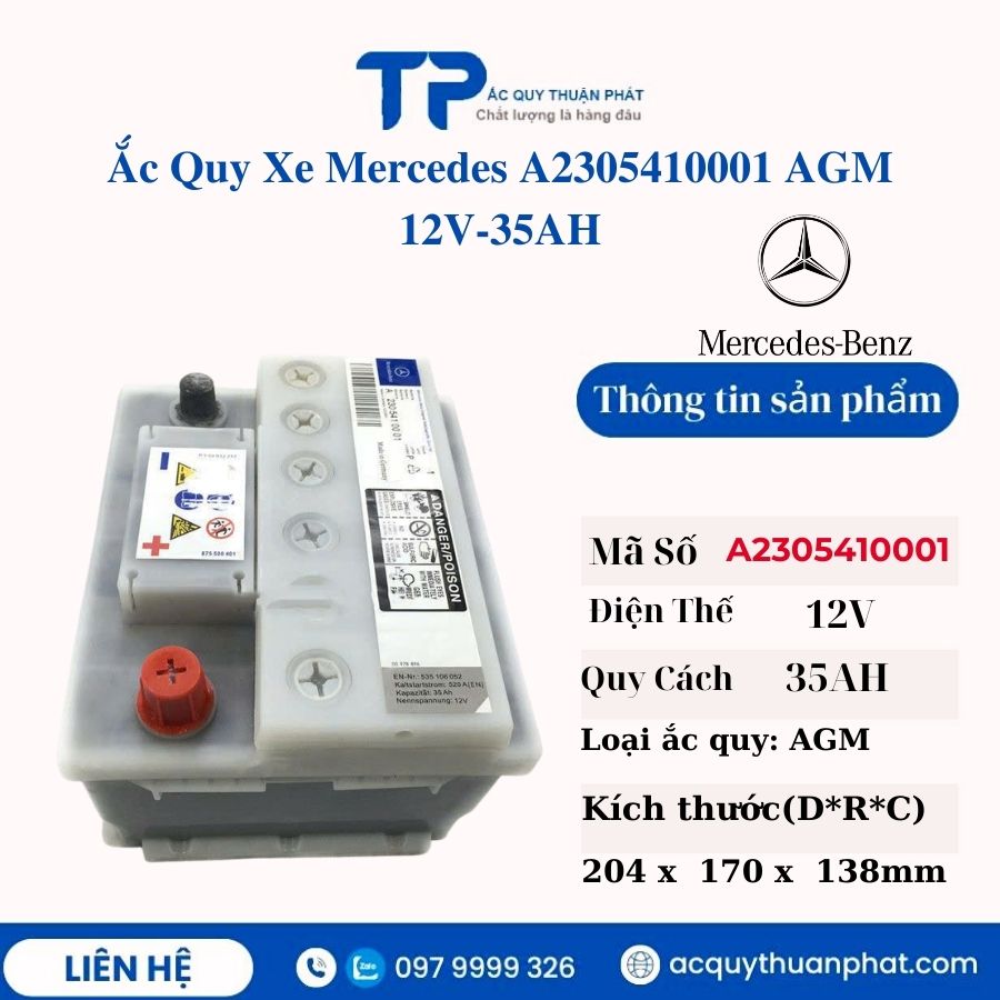 Đối với các dòng xe cao cấp của Mercedes-Benz, hệ thống điện luôn được thiết kế phức tạp nhằm đáp ứng hàng loạt công nghệ hiện đại như Start/Stop, điều khiển điện tử và các tính năng an toàn tiên tiến. Để đảm bảo các hệ thống này vận hành ổn định, bên cạnh ắc quy chính, xe còn được trang bị thêm một ắc quy phụ chuyên dụng. Trong đó, model A2305410001 AGM 12V – 35Ah là một trong những lựa chọn phổ biến trên nhiều dòng xe Mercedes.