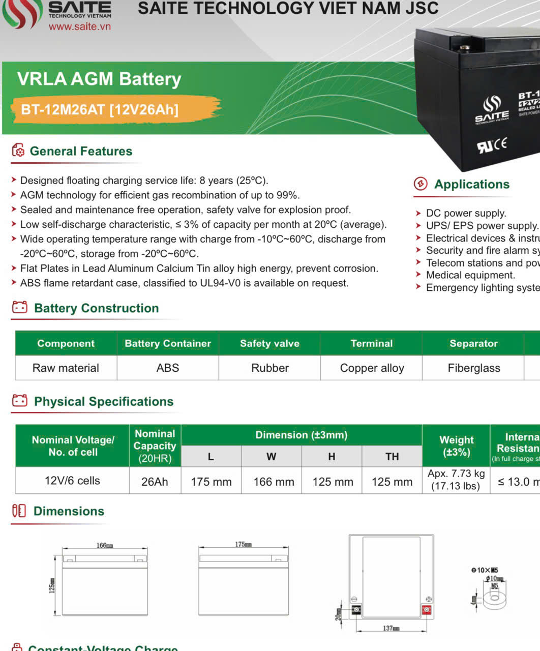 Saite BT 12M26AT thuộc dòng ắc quy khô kín khí, không cần bảo dưỡng, an toàn và thuận tiện trong quá trình lắp đặt. Sản phẩm được thiết kế tối ưu cho khả năng tích trữ điện và cung cấp nguồn ổn định trong thời gian dài.