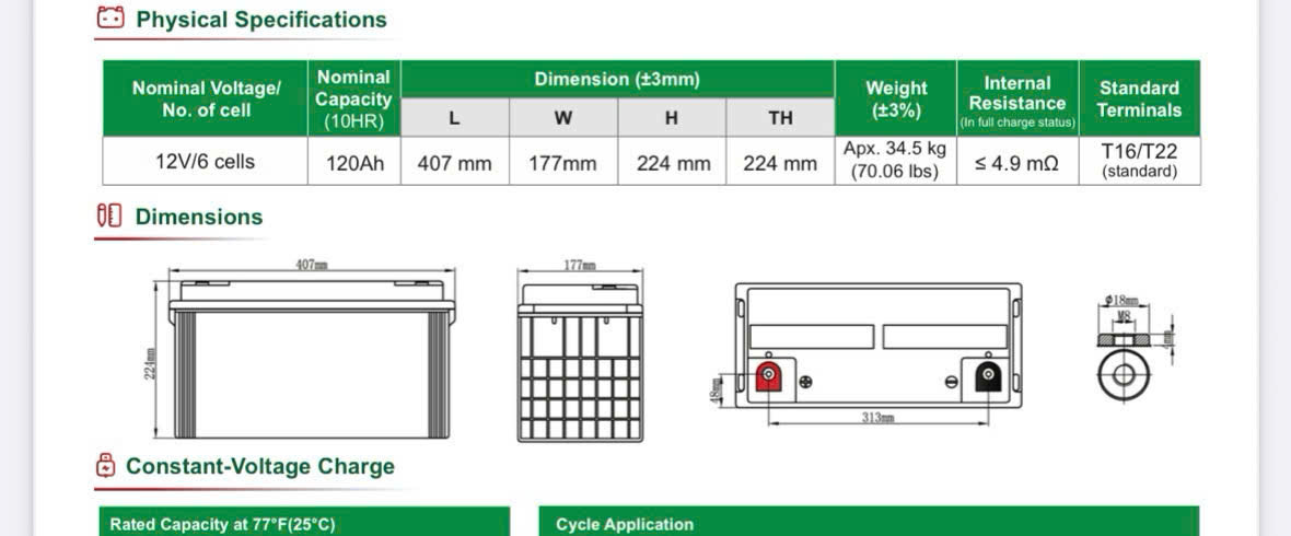 Với dung lượng 120Ah, model này đáp ứng tốt các hệ thống có nhu cầu lưu trữ điện lớn hơn so với các dòng 80Ah hay 100Ah, giúp kéo dài thời gian vận hành thiết bị khi điện lưới gặp sự cố. Dù dung lượng cao, ắc quy vẫn có thiết kế cân đối, thuận tiện lắp đặt trong tủ UPS, tủ nguồn DC, phòng kỹ thuật hoặc trạm viễn thông.