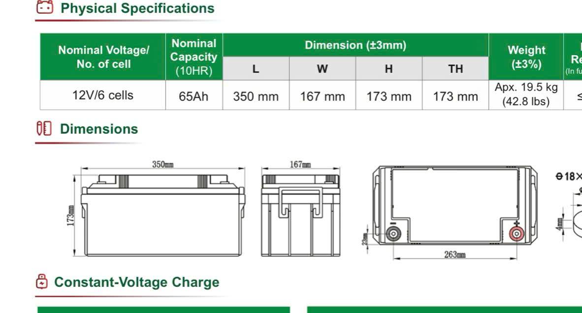 Với dung lượng 65Ah, ắc quy đáp ứng tốt các hệ thống cần thời gian lưu điện dài hơn so với các model 45Ah hoặc 55Ah, đồng thời vẫn giữ được kích thước hợp lý để lắp đặt trong tủ UPS, tủ nguồn DC hoặc phòng kỹ thuật mà không chiếm quá nhiều không gian.